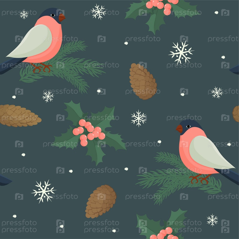 Бесшовный яркий зимний паттерн со снегирем и остролистом