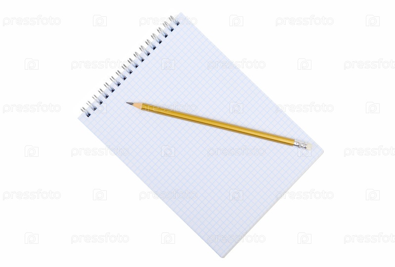 Блокнот и карандаш на белом фоне, крупным планом, вид сверху