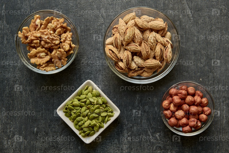 Орехи в стеклянных мисках и очищенные семена тыквы на сером фоне, диета, спортивное питание, вид сверху