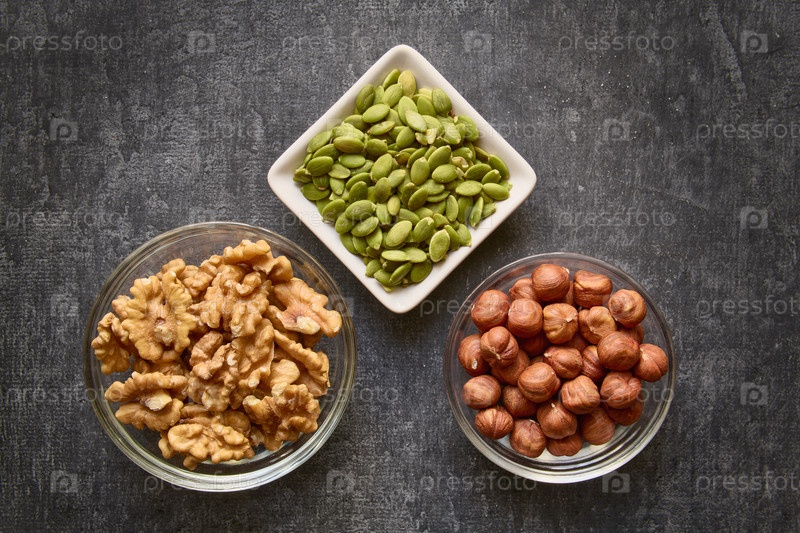 Орехи и семена тыквы крупным планом на сером фоне, здоровый образ жизни