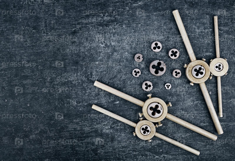 Старые слесарные инструменты, держатель штампов и различные штампы для нарезания внешней резьбы на металлических заготовках с копировальным пространством