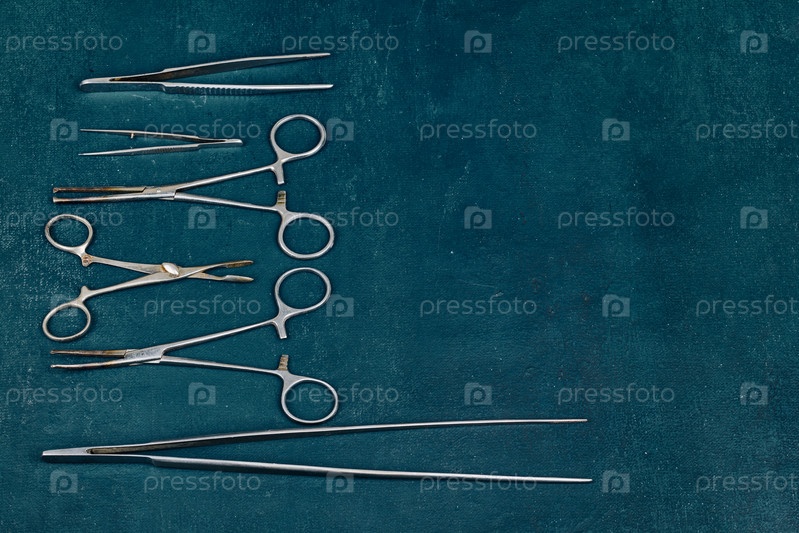 Старые, ржавые, бывшие в употреблении хирургические инструменты на синем фоне, крупным планом