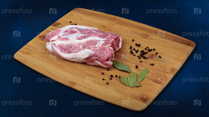 Кусок свиной шеи на деревянной разделочной доске. Мясо, лавровый лист и черный перец. Синий фон