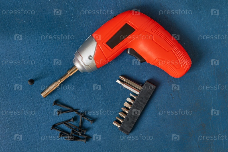 Оранжевая отвертка на синем фоне, винты, набор бит