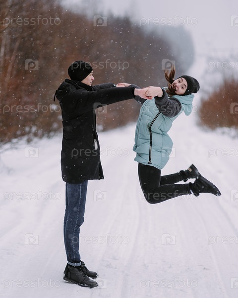 Влюбленная пара подростков, гуляющих и веселящихся в зимнем лесу
