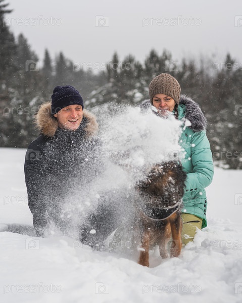 Милая пара развлекается со своей собакой в зимнем лесу