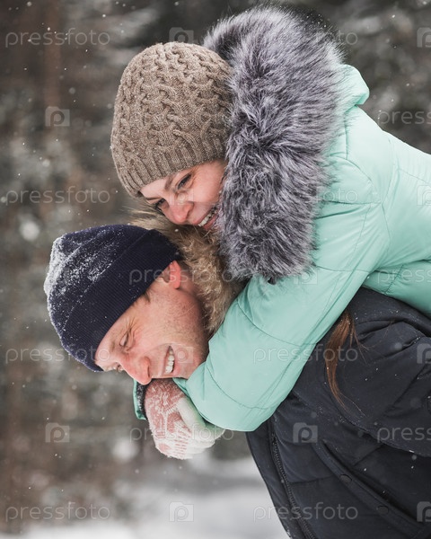 Счастливая молодая пара. Зимой мужчина катается на спине со своей девушкой