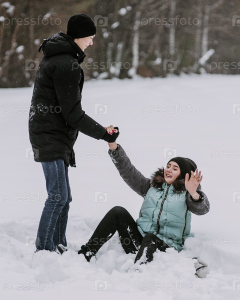 Счастливая пара подростков, весело играющих в снегу в зимнем лесу