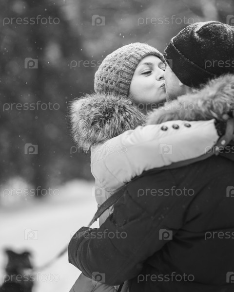Портрет молодой пары в зимнем лесу. Черное и белое