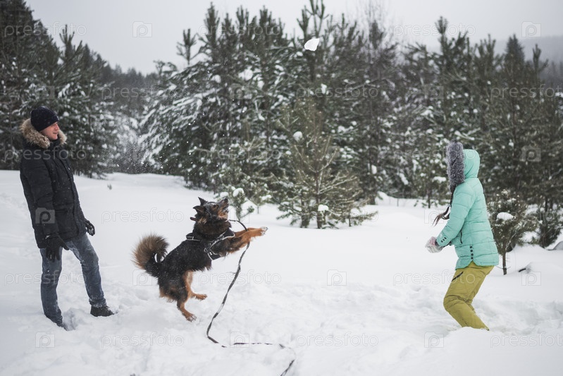 Счастливая молодая пара гуляет с собакой в лесу в зимний день