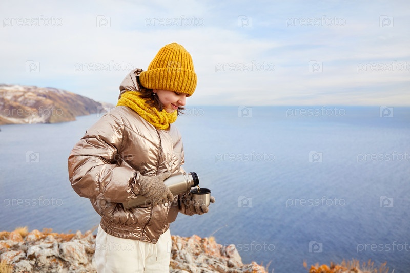 Молодая девушка-путешественница наливает горячий чай в кружку из термоса на природе. Горный зимний пейзаж