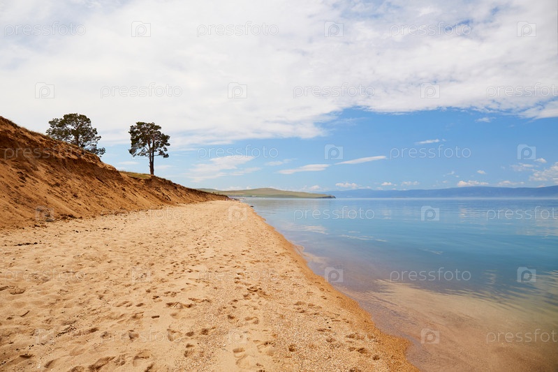 Берег Байкала в пасмурный летний день. Спокойная голубая вода, песчаный пляж. Красивый летний пейзаж