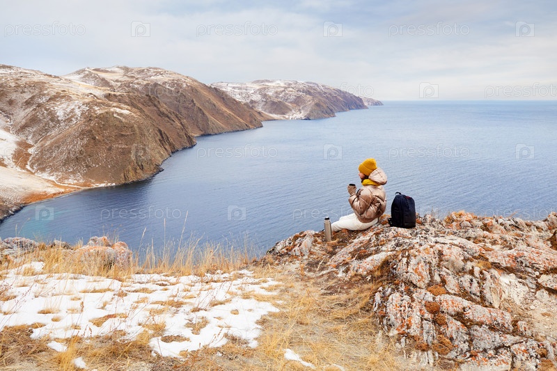 Молодая красивая путешественница сидит на скале с видом на озеро Байкал, держа чашку горячего чая из термоса