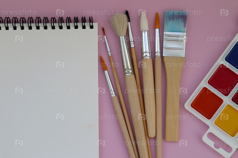 Чистый белый блокнот и кисти на розовом фоне с местом для копирования. Макет, место для макета текста, рисунок. Вид сверху