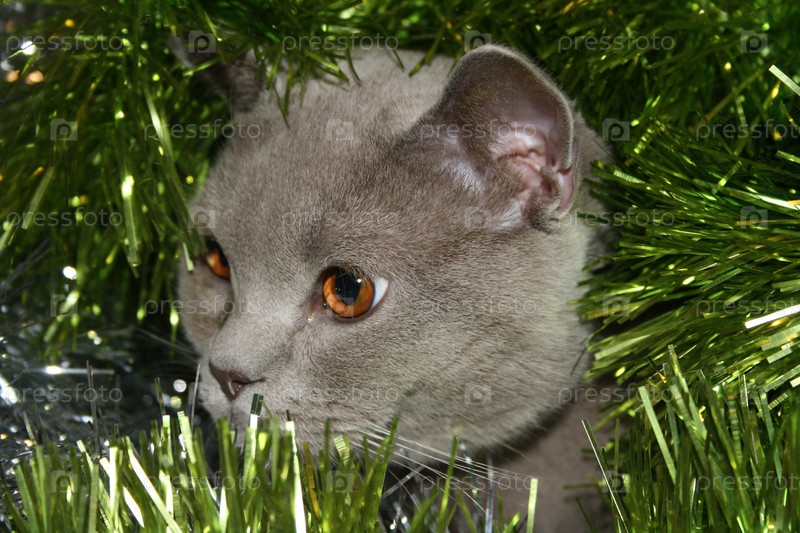 Серый британский короткошерстный котенок в блестящей рождественской гирлянде