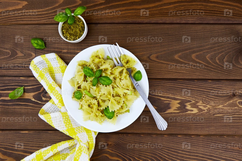 Паста фарфалле с соусом песто на деревянном фоне. Вид сверху