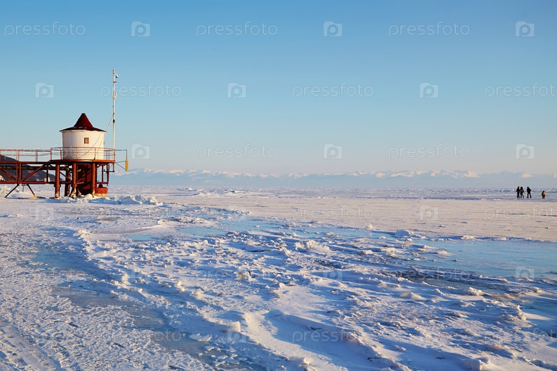 Красивый пейзаж замерзшего озера Байкал. село Листвянка