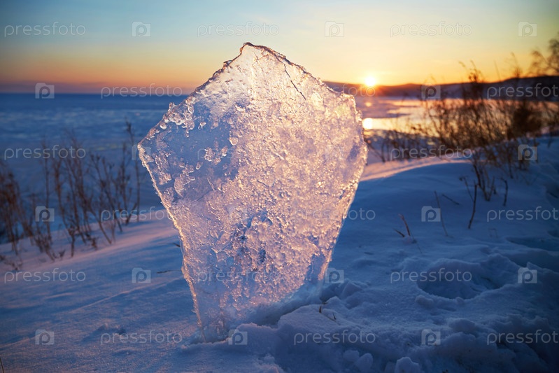 Красивый закат на Байкале. Льдина на фоне красивого заката