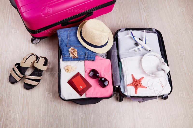 Открытый чемодан с женской одеждой, шляпа, паспорт