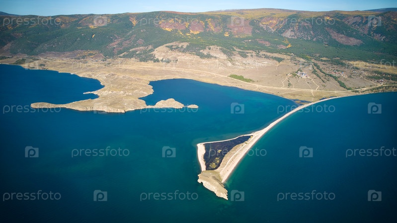 Озеро Байкал с воздуха. Вид на залив у поселка Курма, мыс Уюга