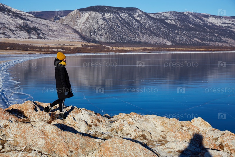 Молодая девушка путешествует по зимнему озеру Байкал. Глядя вдаль, любуясь замерзшим озером