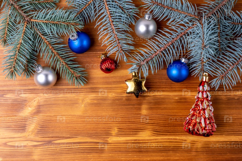 Новогоднее украшение, ветки елки на деревянном фоне. Новый год