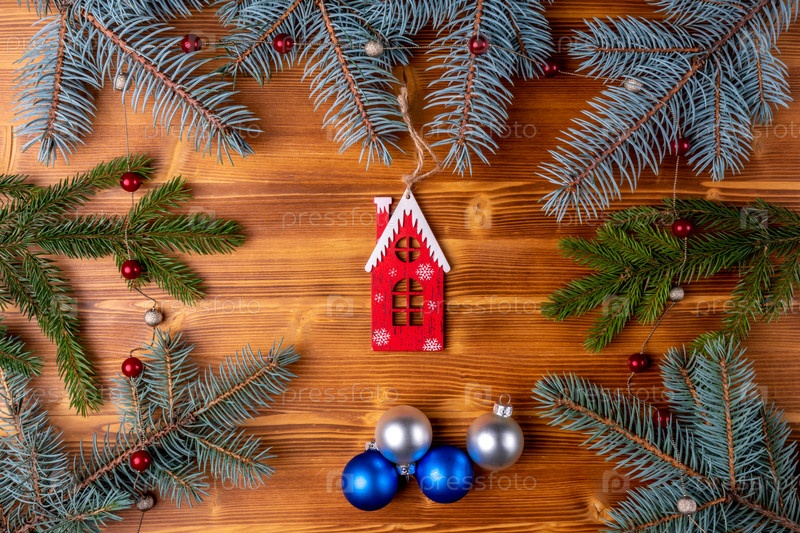 Новогоднее украшение, ветки елки на деревянном фоне. Новый год