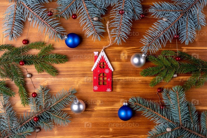 Новогоднее украшение, ветки елки на деревянном фоне. Новый год