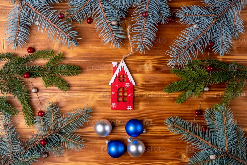 Новогоднее украшение, ветки елки на деревянном фоне. Новый год