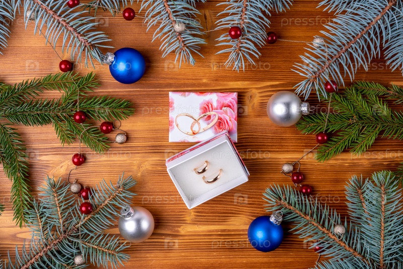 Новогоднее украшение, ветки елки на деревянном фоне. Обручальные кольца