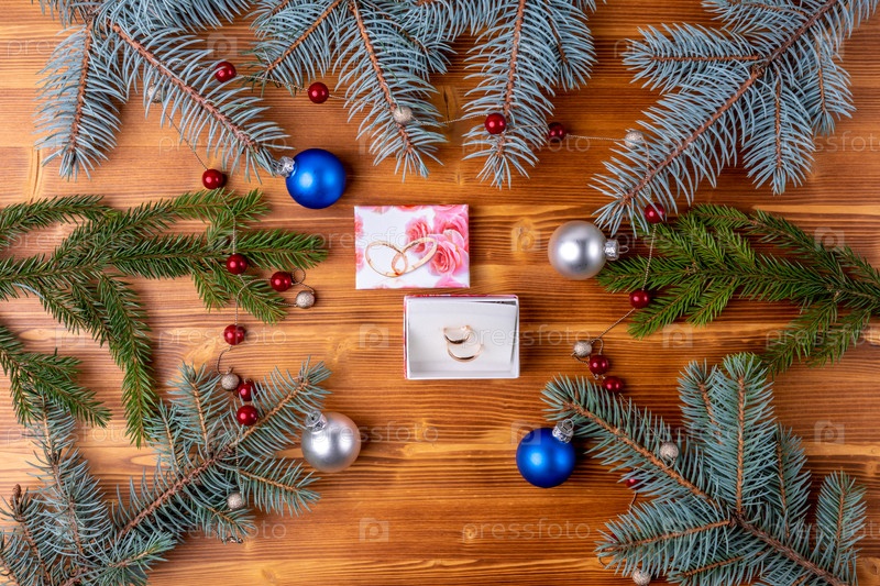 Новогоднее украшение, ветки елки на деревянном фоне. Обручальные кольца