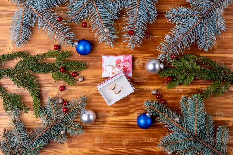 Новогоднее украшение, ветки елки на деревянном фоне. Обручальные кольца