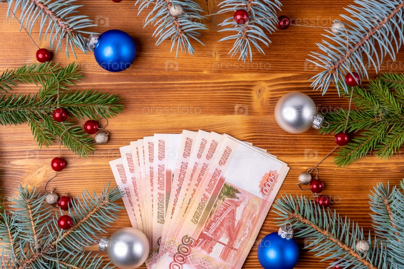 Новогоднее украшение, ветки елки на деревянном фоне. Пятитысячные купюры