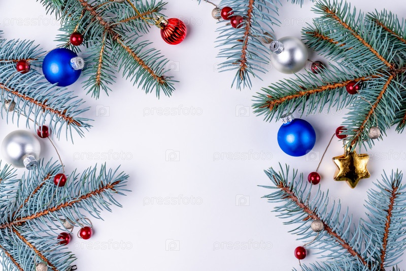 Новый год. Рождественские украшения с ветвями елки, изолированными на белом фоне