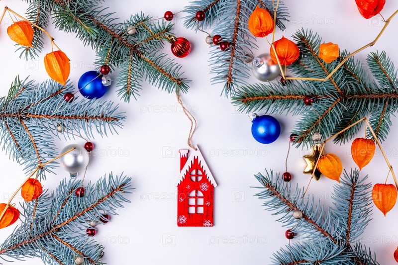 Новый год. Рождественские украшения с ветвями елки, изолированными на белом фоне