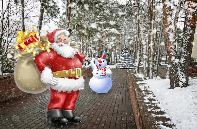 Рождественская история: Дед Мороз с подарками и снежным человеком. 3D-рендеринг