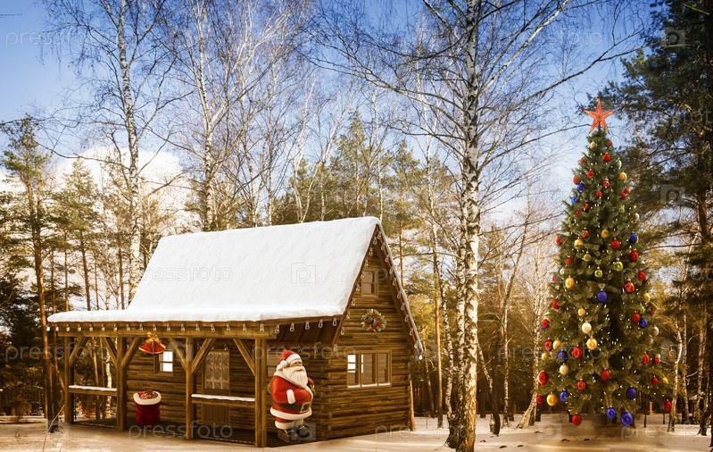 Рождественский пейзаж с Дедом Морозом рядом с домом в лесу и украшенной елкой