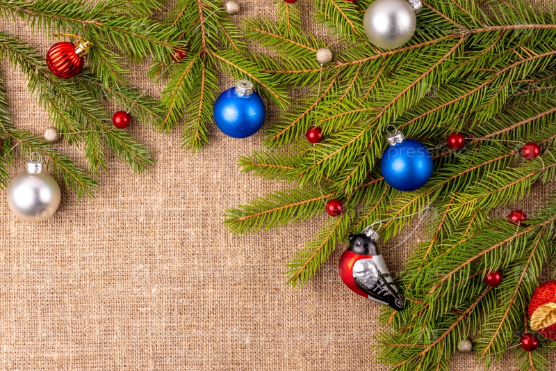 Рождественский фон с текстурой мешковины, ветки елки и игрушки. Новый год