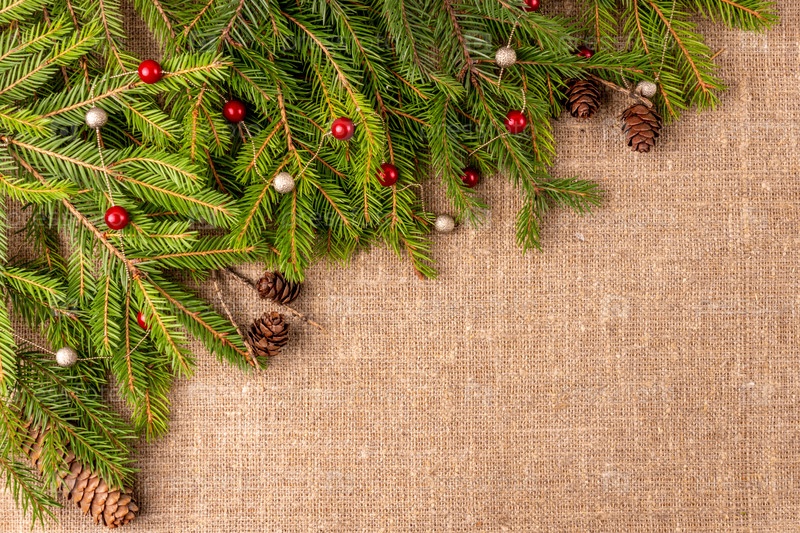 Рождественский фон с текстурой мешковины, ветки елки и игрушки. Новый год