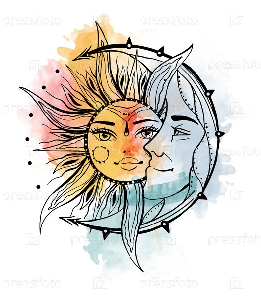 Акварель Луна и солнце. Иллюстрация татуировки в винтажном стиле. Старый сказочный элемент в модном графическом стиле