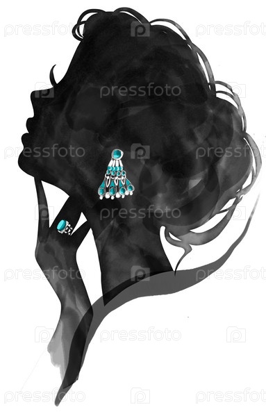 Цифровая акварель черно-белая иллюстрация силуэта. Модель красивой женщины с драгоценностями. Элегантный дизайн карты