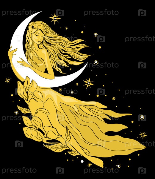 Графический силуэт женщины в стиле арт-деко. Королева луны и звезд. Иллюстрация в плоском стиле. Модная роскошь