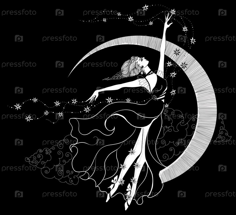 Графический силуэт женщины в стиле арт-деко. Королева луны и звезд. Иллюстрация в плоском стиле. Модная роскошь