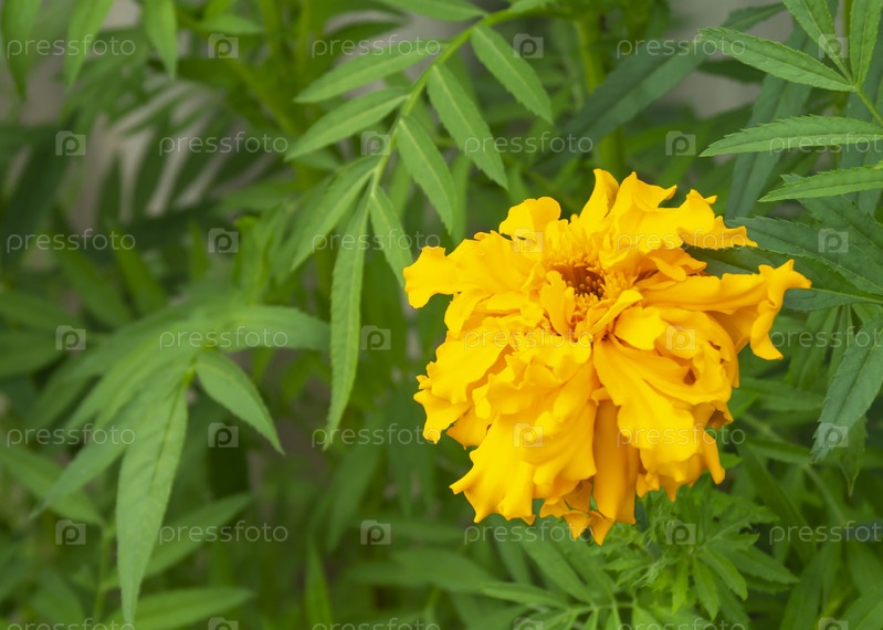 Tagetes erecta на фоне зеленого листа в летнем саду