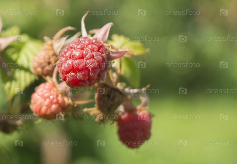 Красная малина на ветке с зеленым листом