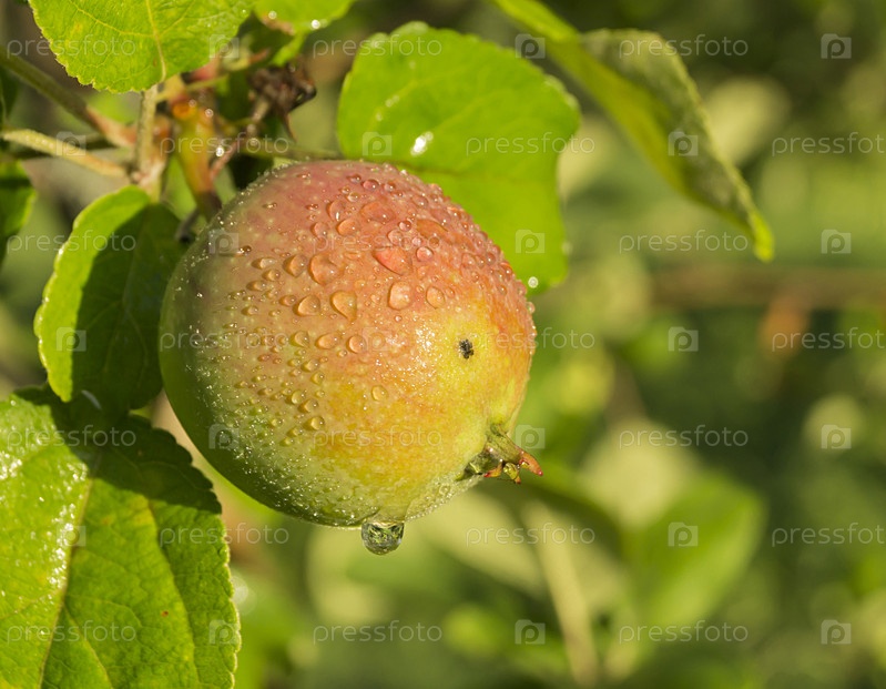 Яблоко на фоне зеленого листа