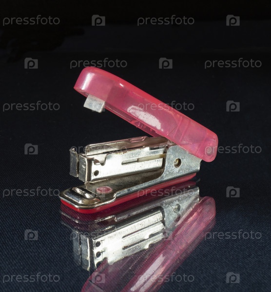 Степлер на столе с отражением на черном фоне