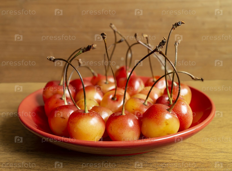 Красные черешни на тарелке на деревянном столе