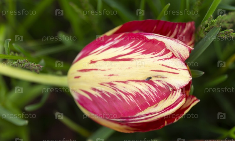 Яркий тюльпан на фоне зеленой травы к весне