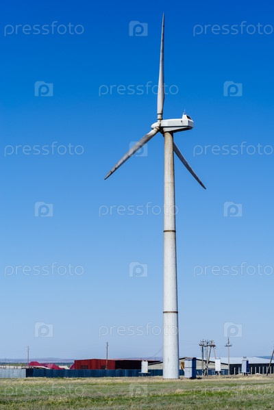 Ветряная турбина возле крупной сельскохозяйственной фермы. Снимок сделан в России, в Оренбургской области